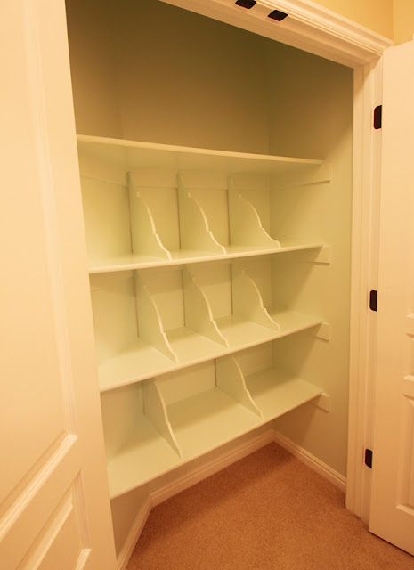 I took some measurements of the depth and height of the shelves. I scoured the Martha Stewart website for a template. Of course, it did not work for the dimensions in my closet. I drew a template, then another, then another, and then finally got one that looked like it would work. Then, I set the person responsible for messing up my closet organization system to work, cutting the brackets out of MDF. Then, I tested his patience a little by suggesting that we might as well go ahead and paint the closet since I had already emptied it anyway. We used some paint already on hand left over from the ceiling in the study. Of course, there wasn't enough so we had to get more.